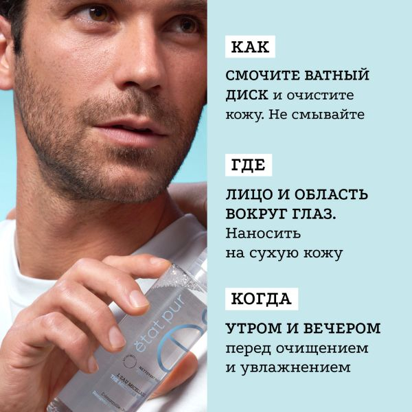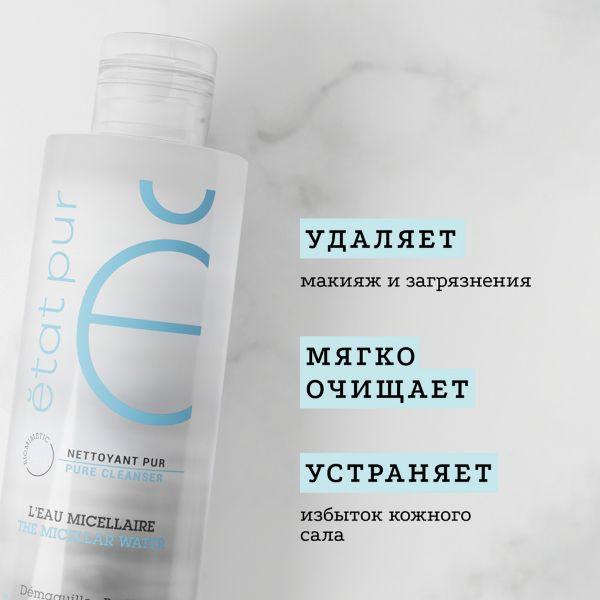 Мицеллярная вода Etat Pur мягко очищает и удаляет макияж с кожи лица и зоны вокруг глаз. Подходит для чувствительной кожи.