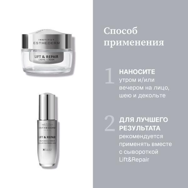 Наносите на чистую сухую кожу лица и шеи утром и вечером как самостоятельное средство, либо после сыворотки LIFT & REPAIR «Абсолютная упругость».