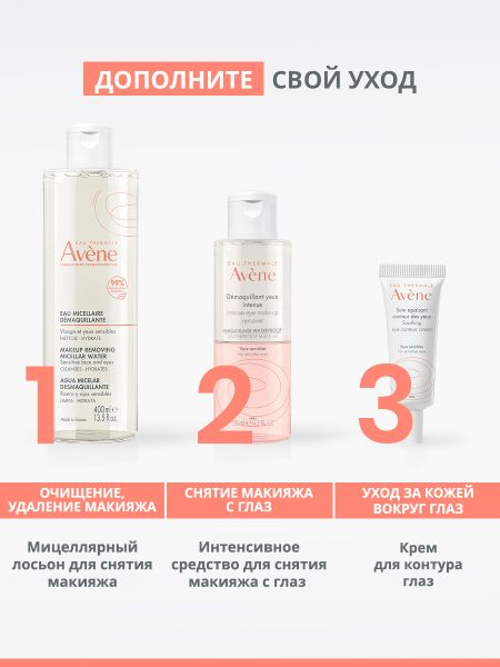 - Двухфазная формула (комбинация термальной воды Avène и масел, удаляющих макияж) для эффективного удаления макияжа