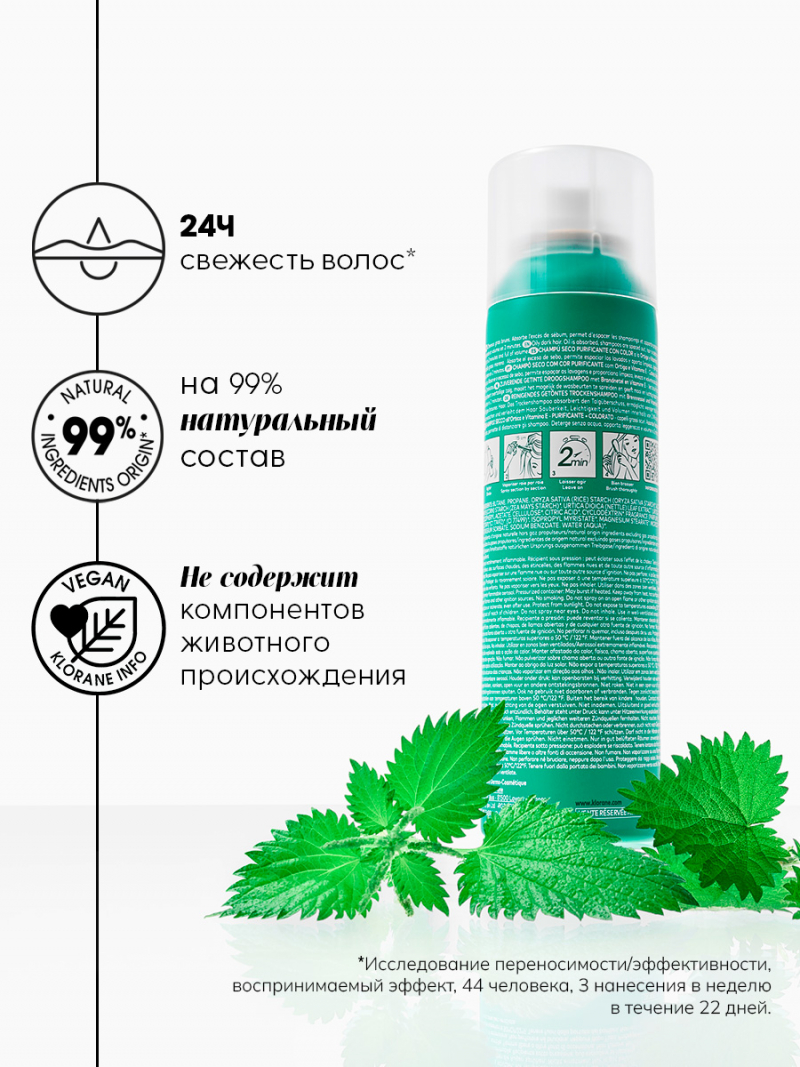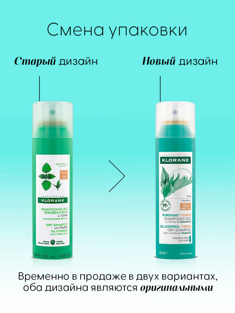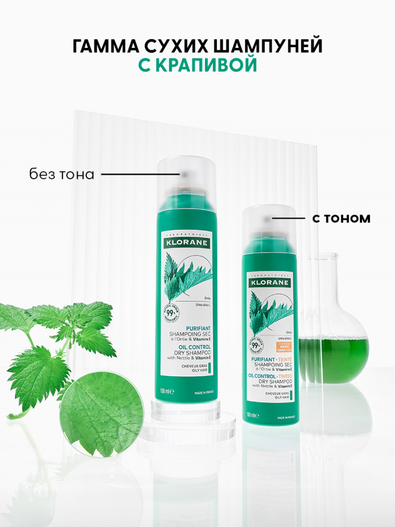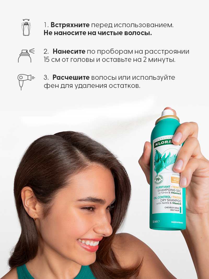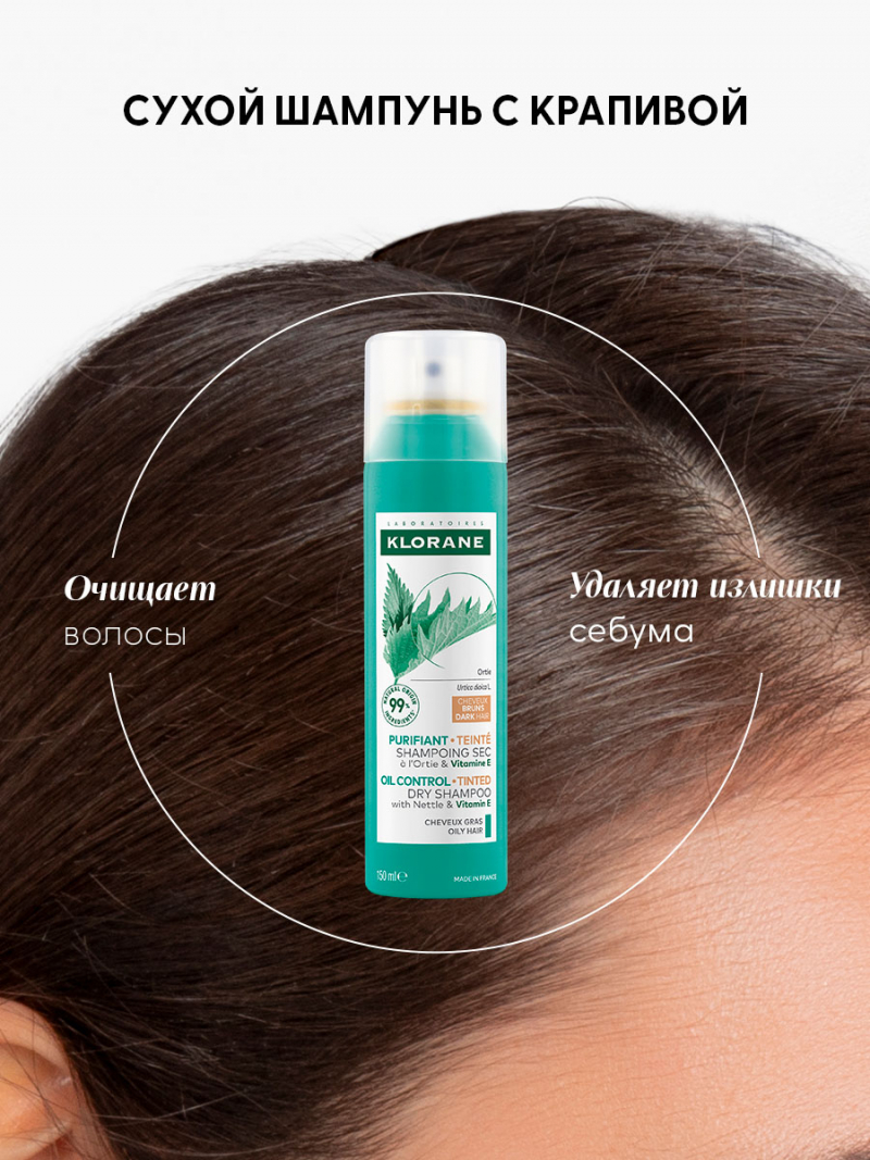KLORANE ТОНИРОВАННЫЙ СУХОЙ ШАМПУНЬ С КРАПИВОЙ И ВИТАМИНОМ Е. Для жирных, темных волос. Свойства: удаляет излишки кожного сала. Сухой шампунь равномерно распределяется по волосам и обеспечивает чистоту, легкость и объем за 2 минуты.