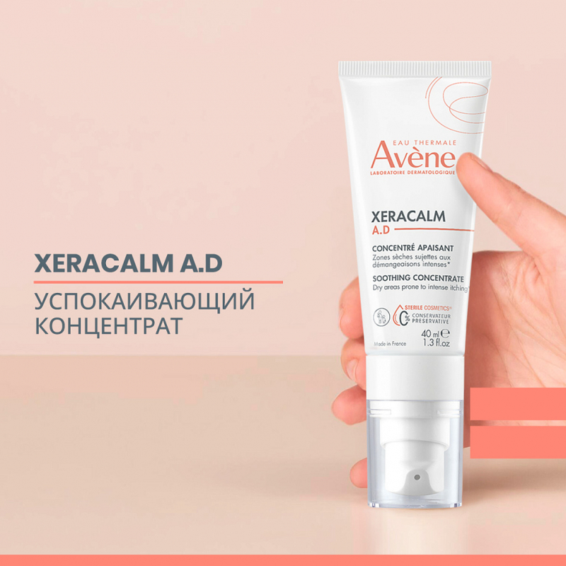 Термальная вода Avene в составе Концентрата Ксеракалм А.Д смягчает и снимает раздражение.