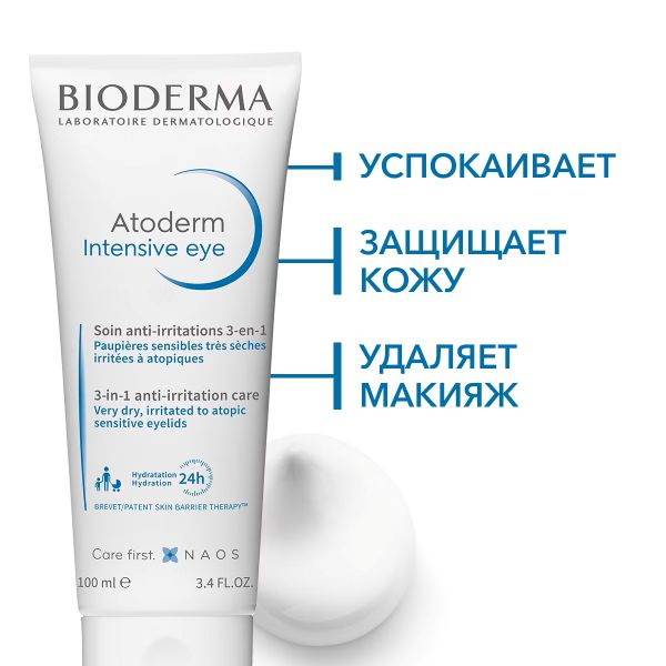 Atoderm Intensive Eye мгновенно и надолго устраняет чувство зуда и раздражения. Уменьшает сухость кожи. Уменьшает покраснения и отечность. Увлажняет и питает кожу. Снимает макияж. Очищает кожу от загрязнений. Защищает кожу. Подходит в качестве основы под макияж.