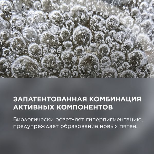 - АНА кислоты и микрогранулы в составе мягко отшелушивают. Запатентованная комбинация активных ингредиентов регулирует биологические механизмы, которые вызывают образование пигментных пятен и оказывает осветляющее действие.