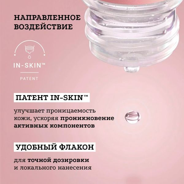 Сыворотка хорошо усваивается кожей благодаря запатентованной технологии IN-SKIN®. Эта запатентованная технология ускоряет поступление активных ингредиентов, чтобы они работали именно там, где кожа больше всего в них нуждается и где они наиболее эффективны.