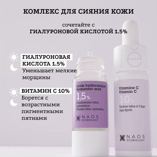 - В составе витамин С в концентрации 10%, который осветляет возрастные пигментные пятна и выравнивает тон кожи. Являясь антиоксидантом, защищает кожу от свободных радикалов, вызывающих тусклый цвет лица, и придает ей сияние.