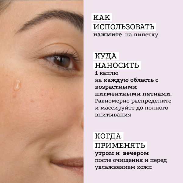 Применяйте утром и вечером на предварительно очищенную сухую кожу. Наносите по 1 капле на каждую зону с пигментацией, (лоб, щеки, скулы и т.д.). Наберите необходимое количество капель продукта с помощью кончика пипетки. Нанесите массирующими движениями до полного впитывания продукта перед использованием увлажняющего крема. Рекомендуем использовать курсом в течение 8 недель.