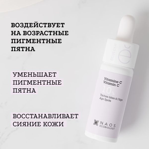 Витамин С эффективно воздействует на пигментные пятна, восстанавливает сияние кожи. Концентрированный в 10%, этот активный ингредиент уменьшает пигментные пятна, выравнивает тон кожи и возвращает ей сияние. Темные пятна осветляются, кожа становится более сияющей и выглядит моложе.