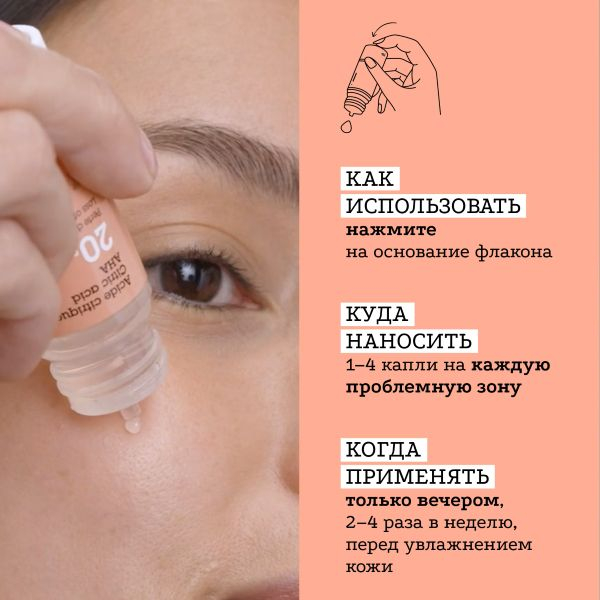 Нажмите на дно в основании флакона и нанесите непосредственно на кожу лица следующее количество: 4 капли на все лицо, или по 1 капле на каждую проблемную зону (расширенные поры, мелкие угри).