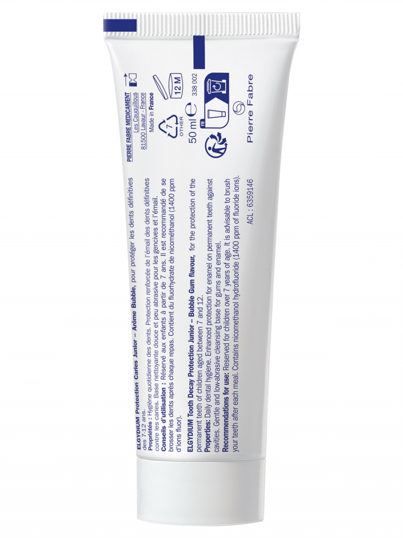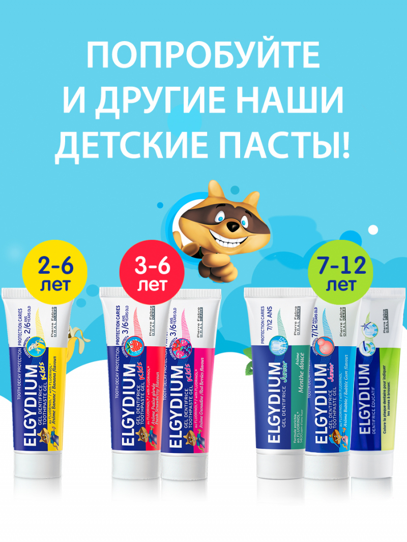 Зубная паста-гель для детей старше 7 лет со вкусом жвачки для защиты от кариеса (ELGYDIUM Tooth Decay Protection Kids Banana Flavour) защищает и укрепляет постоянные зубы у детей в возрасте от 7 до 12 лет благодаря фтору, количество которого адаптировано к потребностям данной возрастной группы (1400 ppm ионов фтора)*.