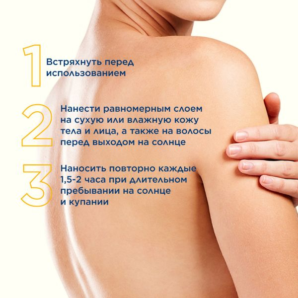 Хорошо встряхните до получения однородной консистенции. Обильно нанесите на кожу перед выходом на солнце (недостаточное количество средства снижает уровень защиты от солнца). Наносите повторно после купания. Распылите на руки перед нанесением на лицо и волосы.