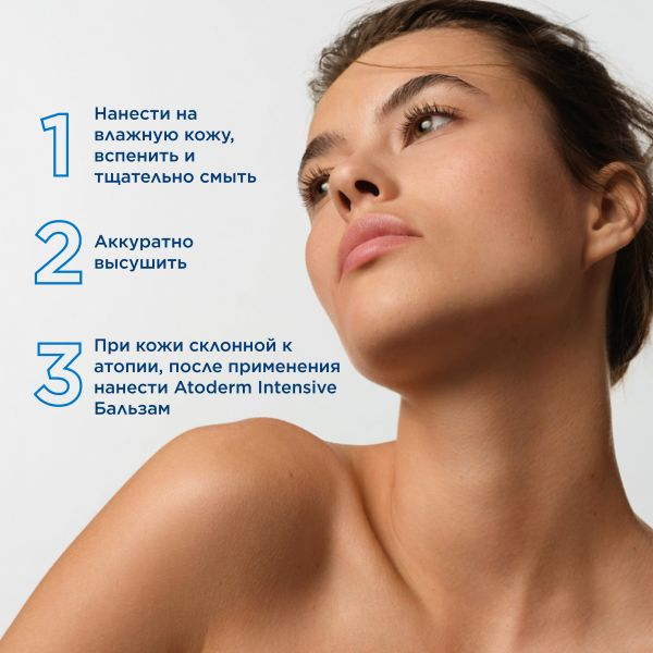 Вспенить и нанести пену на влажную кожу лица и/или тела круговыми движениями. Смыть. Рекомендуем после очищения нанести Атодерм Бальзам Интенсив.
