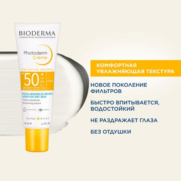 Солнцезащитный крем Bioderma Photoderm с фактором защиты от UVA / UVB излучений 50+. Защищает клетки от повреждения и предотвращает процессы преждевременного старения. Идеально подходит сухой и нормальной коже, легко распределяется и не оставляет жирной пленки.
